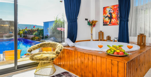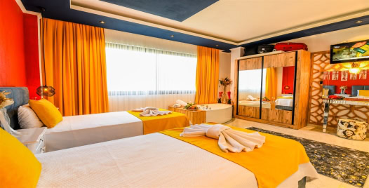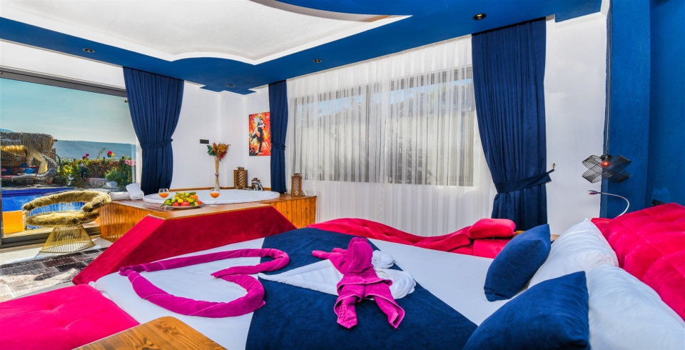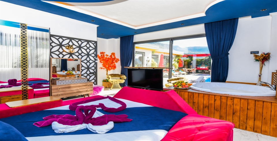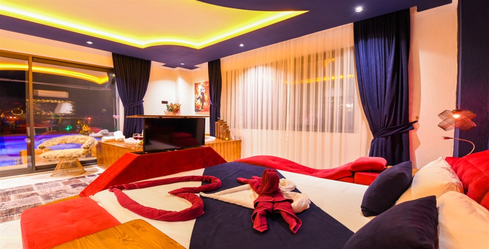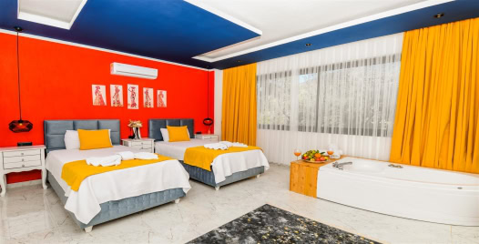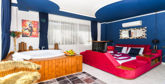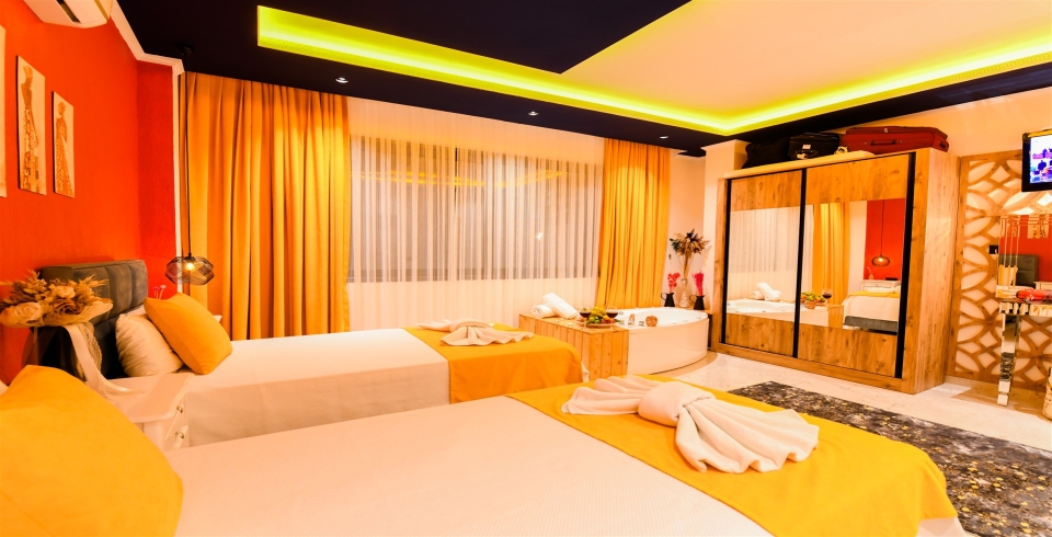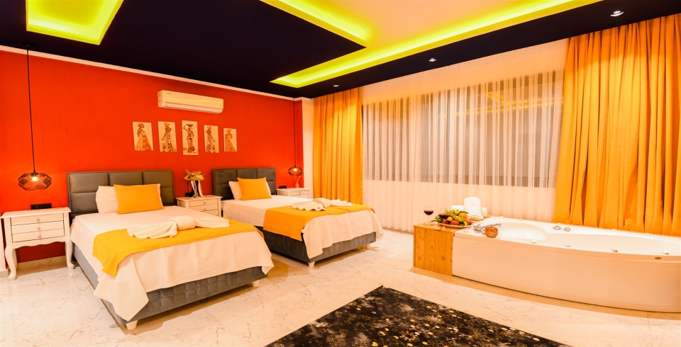 1. Yatak Odası : 1 adet çift kişilik yatak, televizyon, klima, jakuzi, komodin, masaj koltuk ,elbise dolabı, makyaj masası, banyo ve lavabo bulunmaktadır.