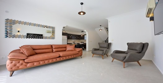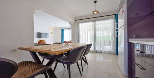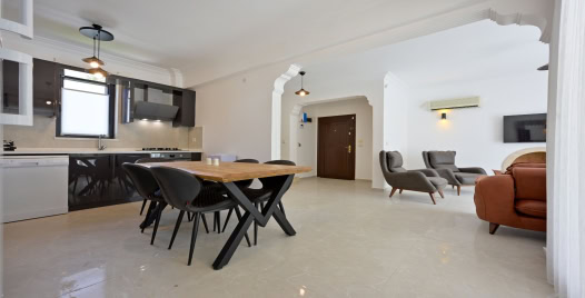 Salon: Özenle döşenmiş salon, modern koltuklar, 8 kişilik yemek masası, LCD TV ve klima bulunmaktadır.