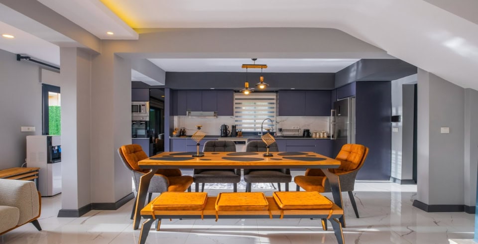 Mutfak: Açık planlı mutfak, 8 kişi ve daha fazla kişiye yetecek kadar mutfak malzemeleri, buzdolabı, fırın, ocak, mikrodalga fırın, bulaşık makinesi, çamaşır makinesi, tost makinesi, kettle ve çaydanlık bulunmaktadır..