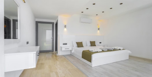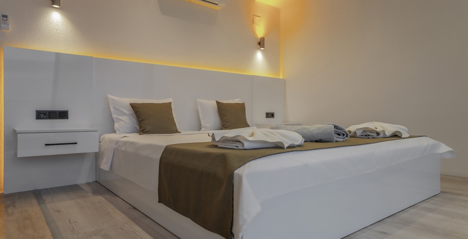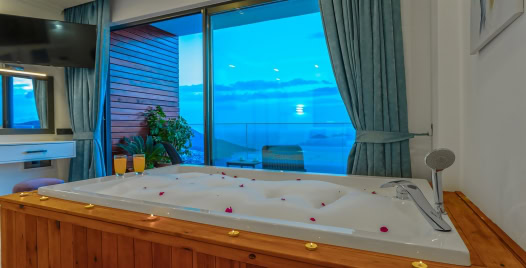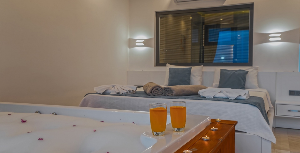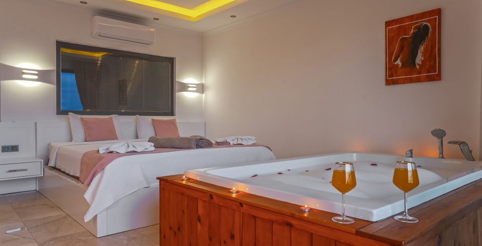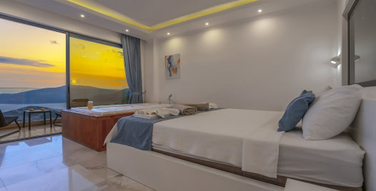 1. Yatak Odası : 1 Adet çift kişilik yatak, komodin, gardırop, makyaj masası, klima, balkon, Jakuzi, tuvalet ve banyo bulunmaktadır. Odamızdan deniz manzarası görülmektedir.