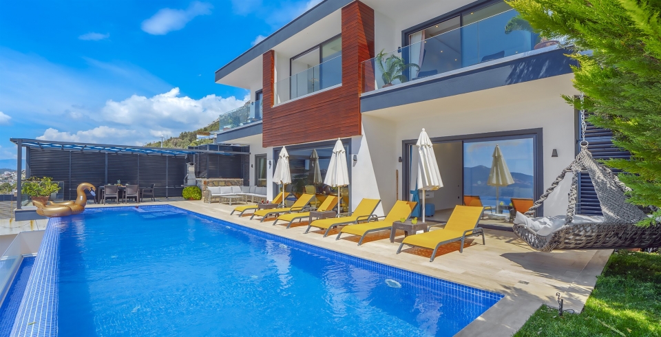 Havuz ve Bahçe: Oturma grubu , barbekü, şezlong, güneş şemsiyesi, yemek masası, salıncak bulunmaktadır. Villamızın havuzundan sonsuzluk deniz manzarası görülmektedir.