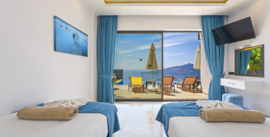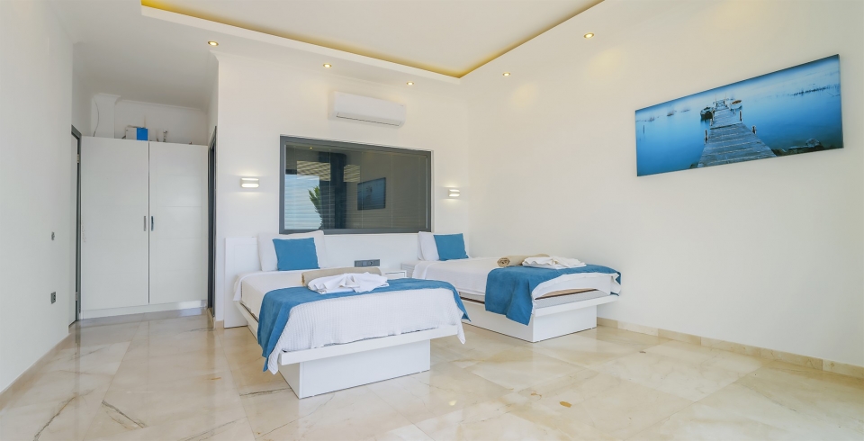 4. Yatak Odası : 2 Adet tek kişilik yatak, komodin, gardırop, makyaj masası, klima, tuvalet ve banyo bulunmaktadır. Odamızdan deniz manzarası görülmektedir.