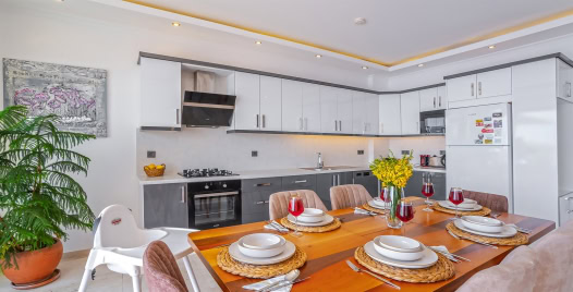 Mutfak : Mutfak bölümümüzde, buzdolabı, bulaşık makinesi, çamaşır makinesi, fırın, mikrodalga fırın çatal & bıçak takımı, yemek takımı, kettle vb. mutfak ekipmanları bulunmaktadır.