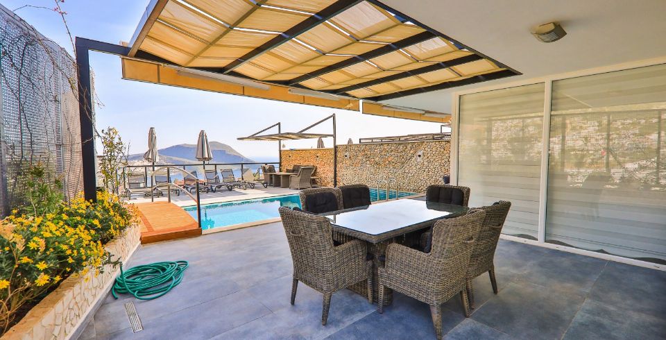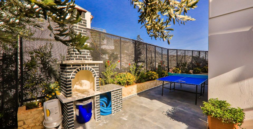 Dış mekânda özel yüzme havuzu, şezlonglar, gölgeli oturma alanları ve barbekü köşesi yer alır. Teras alanı manzaranın tadını çıkarabileceğiniz ferah oturma gruplarıyla donatılmıştır. Havuz terası ve bahçe, dış görüşe kapalı şekilde düzenlenmiş olup mahremiyet arayan tatil severlere hitap eder.