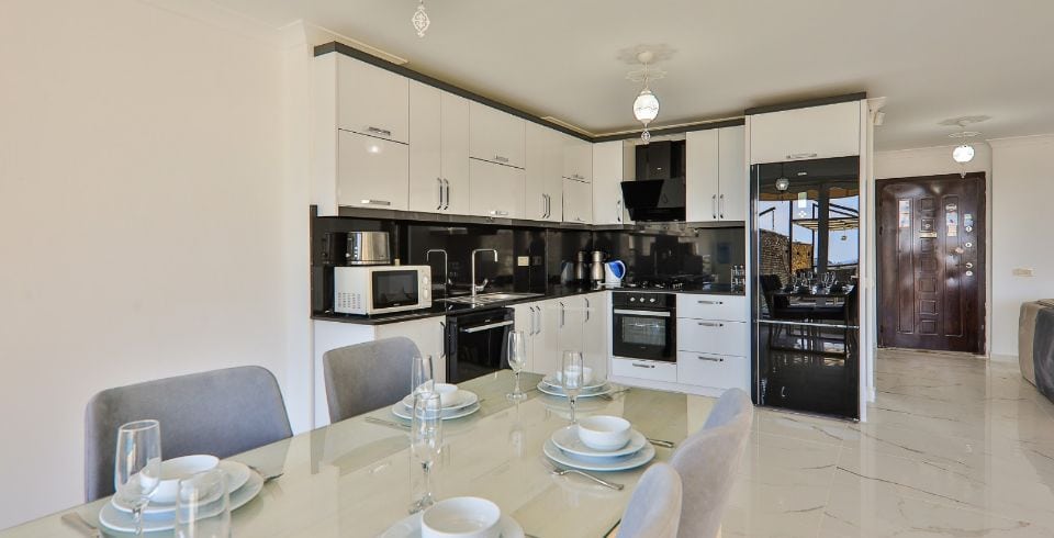 Mutfak: Amerikan Mutfak , buzdolabı , çamaşır makinası , bulaşık makinası , ankastre fırın , mikrodalga fırın , 4 ' lü ocak , tost makinası , elektrikli su ısıtıcısı, yemek takımı , çatal bıçak seti , tavalar , tencereler , bardaklar bulunmaktadır.