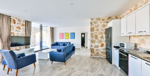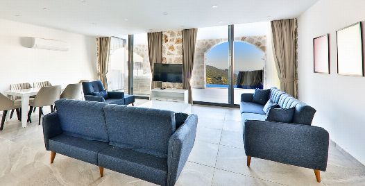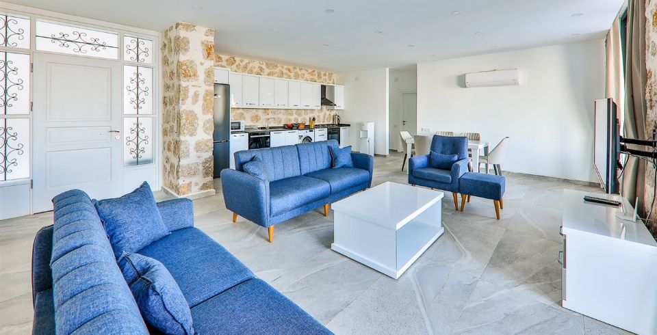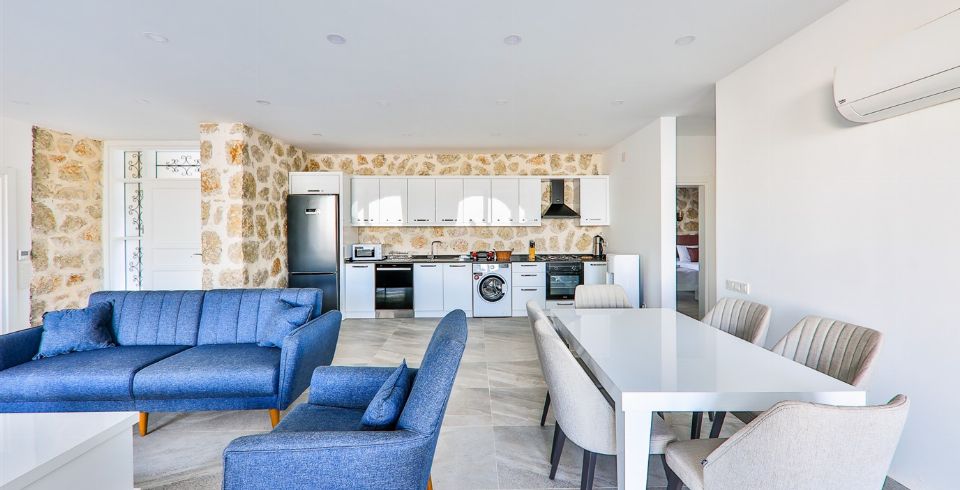 Mutfak: Modern Amerikan mutfak, deniz manzaralı, buzdolabı, bulaşık makinesi, çamaşır makinesi, su sebili, fırın, mikrodalga fırın, 4’lü ocak, elektrikli su ısıtıcısı, 6 kişilik yemek takımı, tava, tencereler, çatal, bıçak vs.