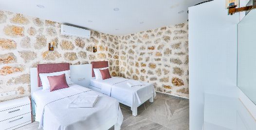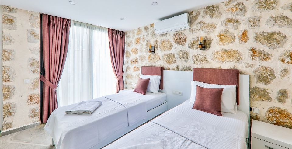 1. Yatak Odası: Tek kişilik 2 adet yatak, elbise dolabı, komodin, makyaj masası, klima, banyo ve tuvalet bulunmaktadır.