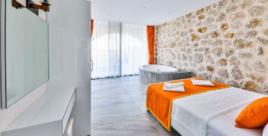 2. Yatak Odası: Çift kişilik yatak, jakuzi, elbise dolabı, komodin, makyaj masası, banyo, tuvalet, balkon, klima bulunmaktadır. Havuz terasına çıkış bulunmaktadır.