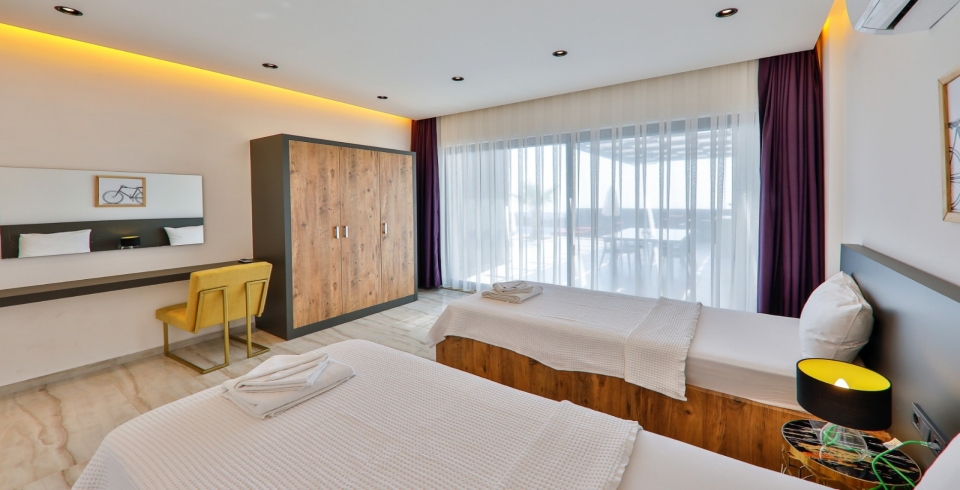 2. Yatak Odası : 2 adet tek kişilik yatak, klima, elbise dolabı, makyaj masası, komodin, banyo ve WC bulunmaktadır.