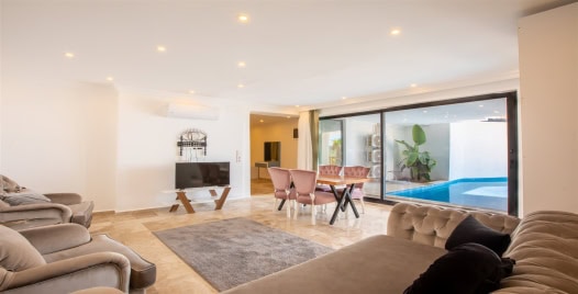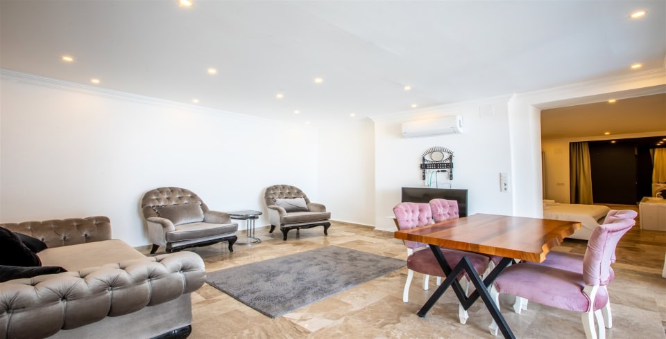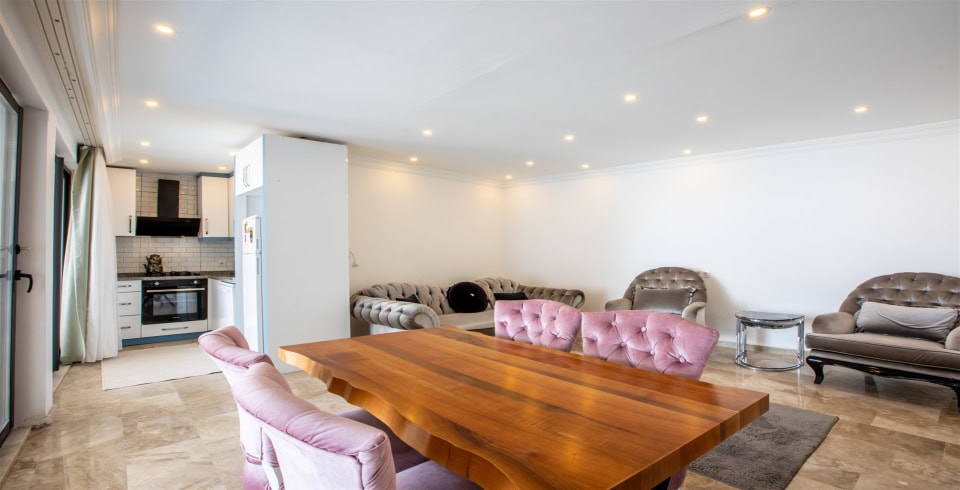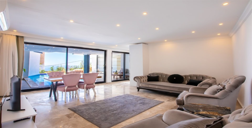 Salon : Sizi şık bir oturma grubu ile klima, televizyon, internet, uydu, koltuk, sehpa ile ferah bir salon bekliyor olacaktır. Havuz terasına çıkış yapılmaktadır.