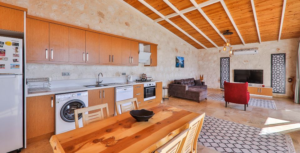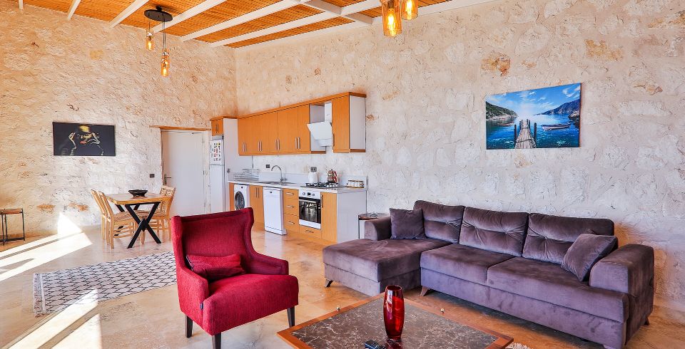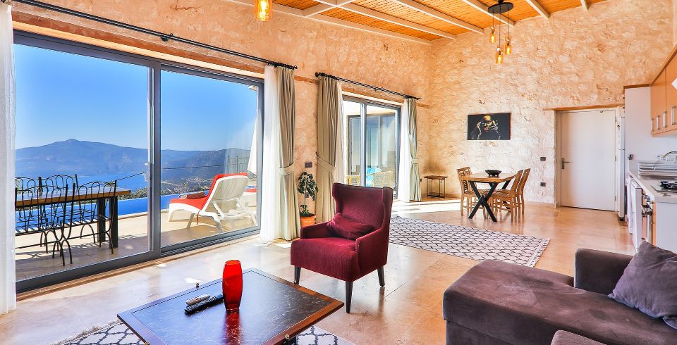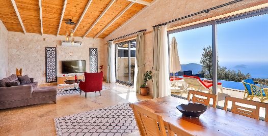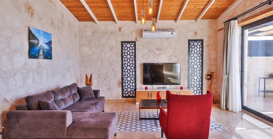 Salon : Deniz ve doğa manzaralı salonumuzda rahat ve konforlu oturma grubu sizi tatilde olduğunuzu bir kez daha unutturmuyor. Hem eşsiz doğa manzarası hem de rahat oturma grubumuz ile sevdiklerinizle doyasıya muhabbet ederek tatilinize keyif katabilirsiniz. Zengin bir tatil menüsünün keyfine varabileceğiniz 4 kişilik yemek masası, gündelik hayatınızda izlemeye fırsat bulamadığınız filmleri tatilde doyasıya izlemeniz için uydu ve TV(LCD), yazın Kalkan’ın sıcak havasından, kışın da soğuk havasından korunmanız için klima bulunmaktadır.