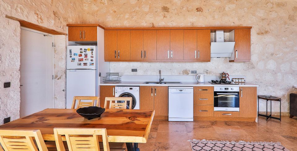 Mutfak : Her şeyin en ince detayına kadar düşündüğümüz mutfakta geniş, ferah ve modern dizayn edilmiş Amerikan mutfak buzdolabı, bulaşık makinası, çamaşır makinası, fırın, 4lü ocak (ankastre), mikrodalga fırın, elektrikli su ısıtıcısı, tava ve tencere vb. mutfak ekipmanları, 4 kişilik yemek takımı bulunmaktadır.