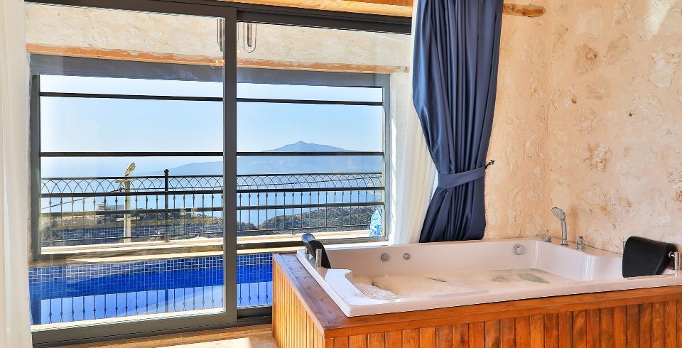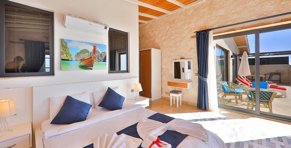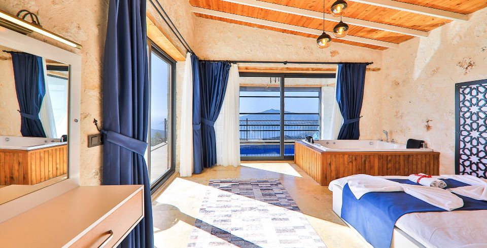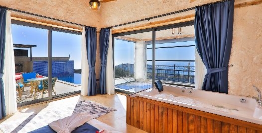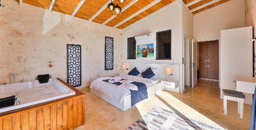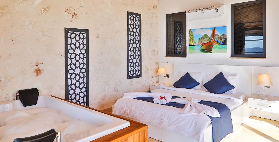 Yatak Odası : Çift kişilik yatak, klima, banyo, elbise dolabı, komodin, saç kurutma makinası bulunmaktadır. Yatak odasında son derece lüks bir jakuzi bulunmaktadır. Bu jakuzi içinde günün yorgunluğunu rahatça atabilir, kapalı ısıtmalı havuz ile tatilinizin keyfini doyasıya çıkarabilirsiniz.