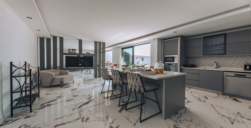 Mutfak: Villamızın amerikan mutfağı içerisinde, buzdolabı, bulaşık makinası, çamaşır makinası, yemek masası, yemek takımı, ankastre fırın, mikrodalga fırın, tost makinası, ankastre ocak, çaydanlık, su ısıtıcısı, tava, tencere takımı ve gerekli olan tüm mutfak gereçleri yer almaktadır.