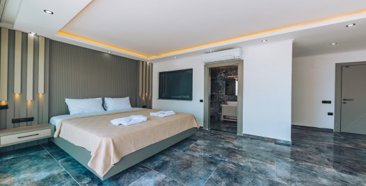 1.Yatak odası: 1 adet çift kişilik yatak, klima, elbise dolabı, komodin, makyaj masası, jakuzi, banyo ve tuvalet alanları bulunmaktadır.