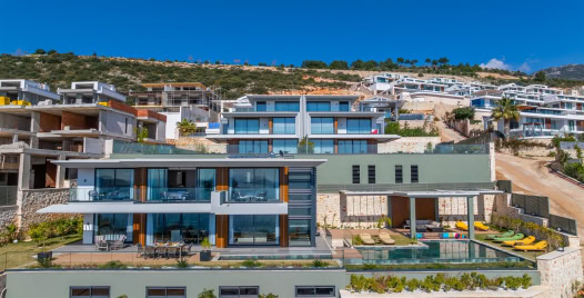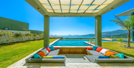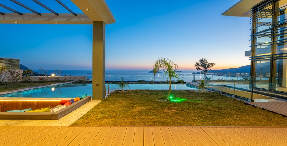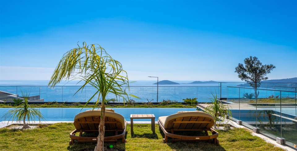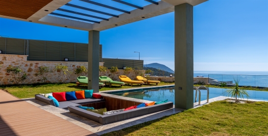 Bahçe : Full Kalkan deniz manzarası gören havuz terasında, özel yüzme havuzu, çocuk havuzu, oturma alanı, şezlong, şemsiye, oturma grubu, yemek masası, barbekü, bulunmaktadır.