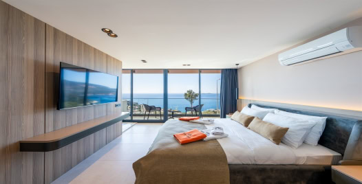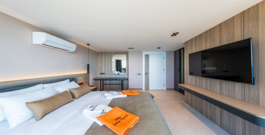 1. Yatak Odası : 1 adet çift kişilik yatak, klima, komodin, elbise dolabı, TV, makyaj masası, deniz manzaralı balkon, banyo ve tuvalet bulunmaktadır.
