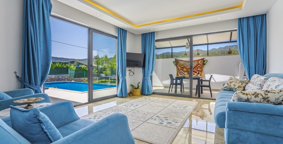 Salon : Villa Sakız’ın salonunda sizi şık bir oturma grubu ile klima, televizyon, internet, uydu, koltuk, sehpa ile ferah bir salon bekliyor olacaktır. Havuz terasına çıkış yapılmaktadır.