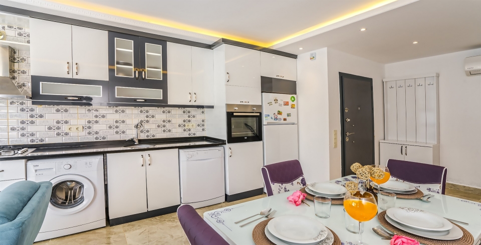 Mutfak : Villamızın geniş Amerikan mutfağı ile sizlere kendi evinizin mutfağı gibi hissettirecek. Ayrıca mutfakta klima, bulaşık makinası, buzdolabı, çamaşır makinası, mikrodalga fırın, tost makinası, ekmek kızartma, su ısıtıcısı, fırın, 4`lü ocak seti ve 4 kişilik geniş yemek masası ile tava tencere vb. mutfak araç gereçlerini kullanma fırsatını sizlere sunuyoruz.