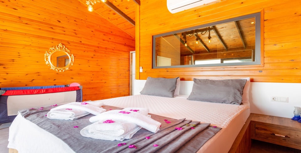 1. Yatak Odası: Çift kişilik yatak, klima, jakuzi, komodin, elbise dolabı, makyaj masası, banyo ve tuvalet bulunmaktadır.