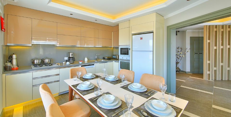 Mutfak : Amerikan Mutfak, buzdolabı, bulaşık makinası, yemek masası, ankastre fırın, mikrodalga fırın, 4'lü ocak, tost makinası, elektrikli su ısıtıcısı, yemek takımı, çatal bıçak seti, tavalar, tencereler, bardaklar bulunmaktadır.