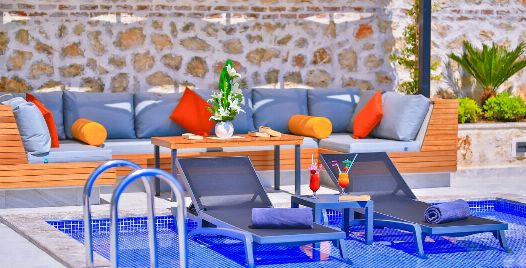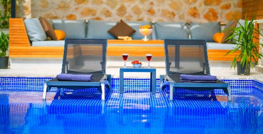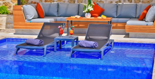 Havuz ve Bahçe : Kiralık yazlık villamızın özel yüzme havuzu ve havuz terasında Şezlonglar, güneş şemsiyesi, mangal, yemek masası ve sandalyeler bulunmaktadır.