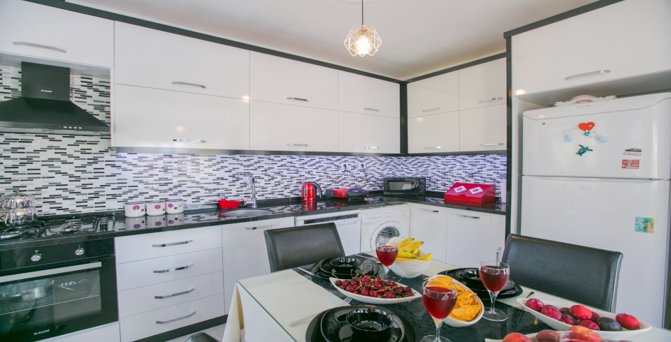 Mutfak : Modern Amerikan mutfak içerisinde buzdolabı, bulaşık makinası, fırın, ocak, mikrodalga fırın, tost makinası, yemek masası, yemek takımları, çatal ve bıçak takımları, tencere ve tava takımları, bardaklar bulunmaktadır.