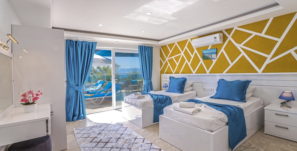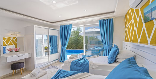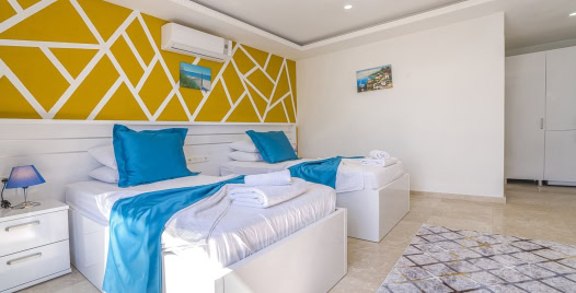 2. Yatak Odası : 2 adet tek kişilik yatak, komodin, klima, makyaj masası, banyo ve lavabo bulunmaktadır.