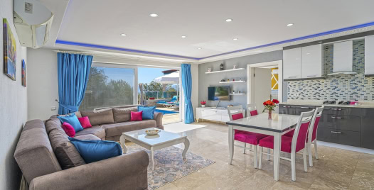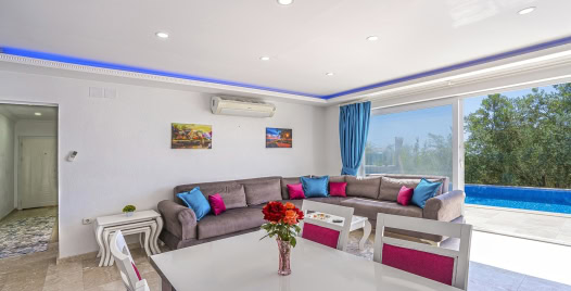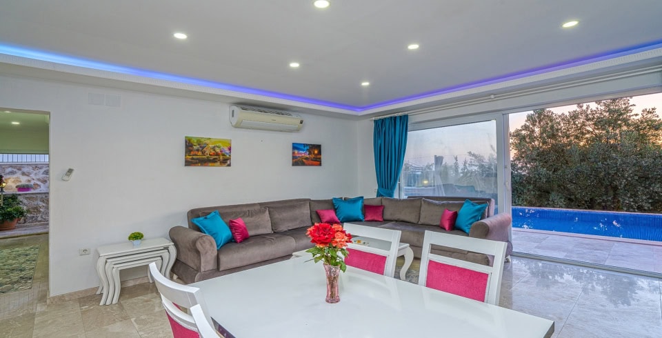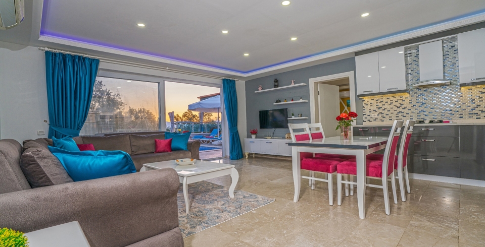 Salon : Villamızın salonunda oturma grubu, tv, internet, klima, yemek masası, sehpa bulunmaktadır.