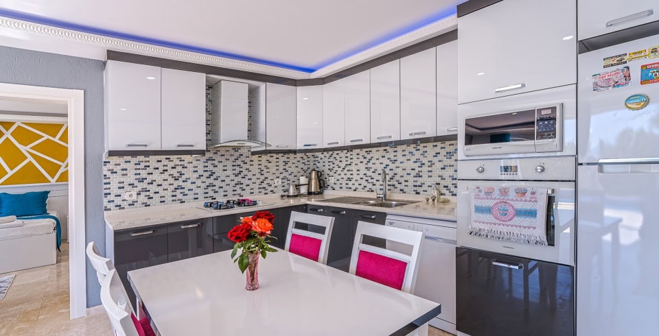 Mutfak : Modern Amerika mutfağımızda 4 kişilik yemek masası, buzdolabı, çamaşır makinesi, 4’lü ocak, tost makinesi, elektrikli su ısıtıcısı, çatal-bıçak takımı, tencere-tava takımı, bulaşık makinesi bulunmaktadır.