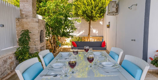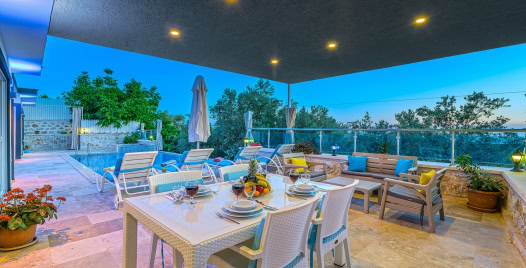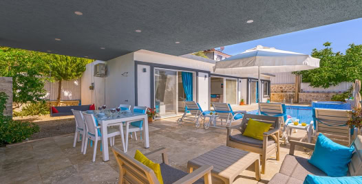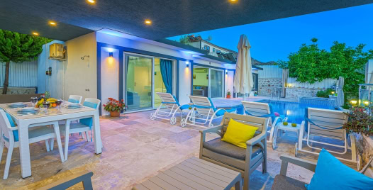 Havuz ve Bahçe :Villamız korunaklı olduğundan dışarıdan görünmemektedir.Oturma grubu,şezlonglar, şemsiye, yemek masası ve barbekü bulunmaktadır.