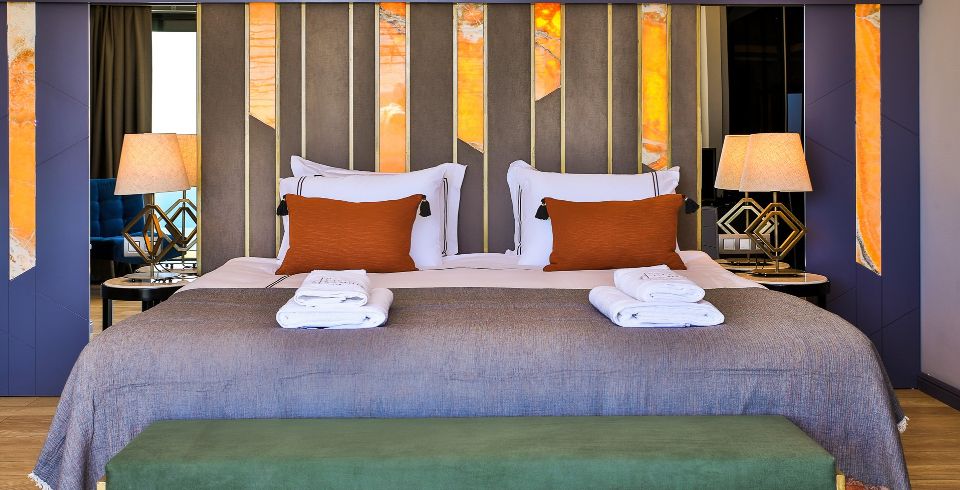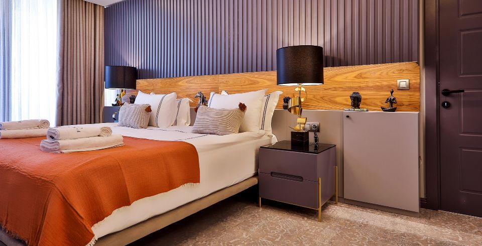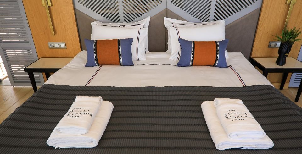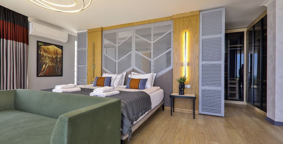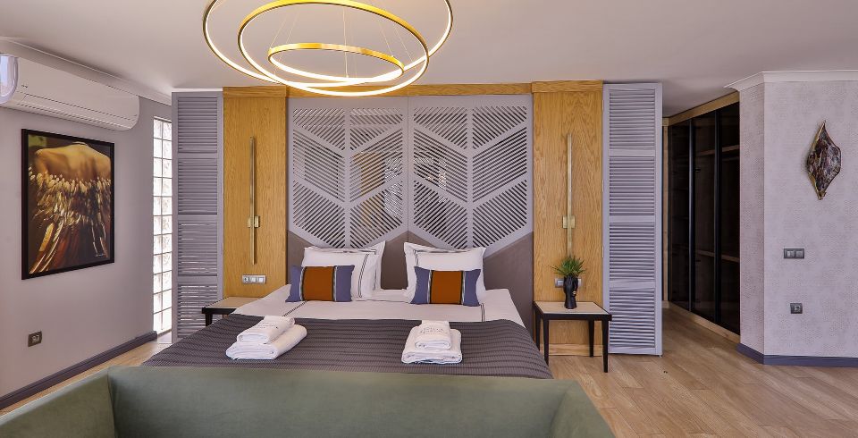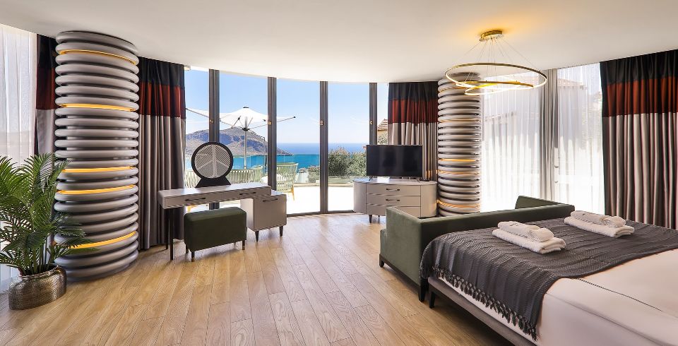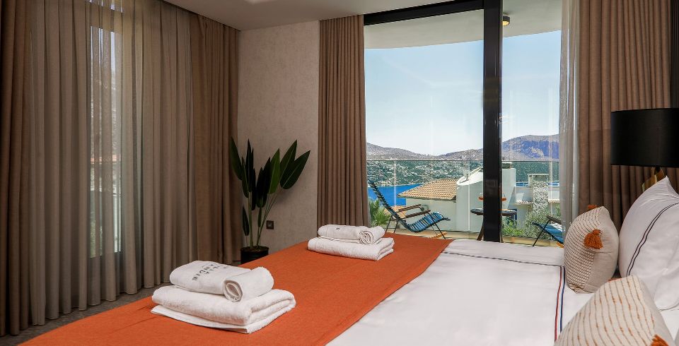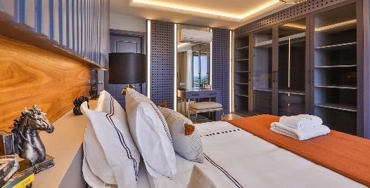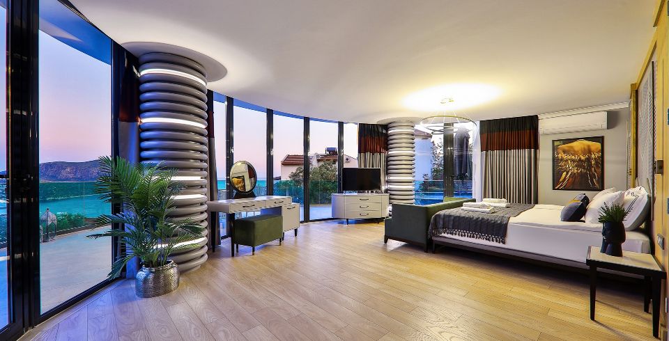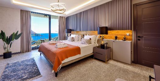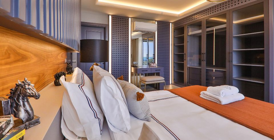1. Yatak Odası: Birinci katta bulunan deniz manzaralı en-süit aile yatak odasında çift kişilik yatak, makyaj masası, klima, elbise dolabı, komodin ve ebeveyn banyosu bulunmaktadır.