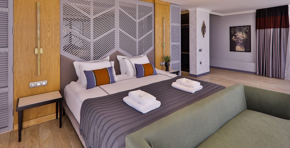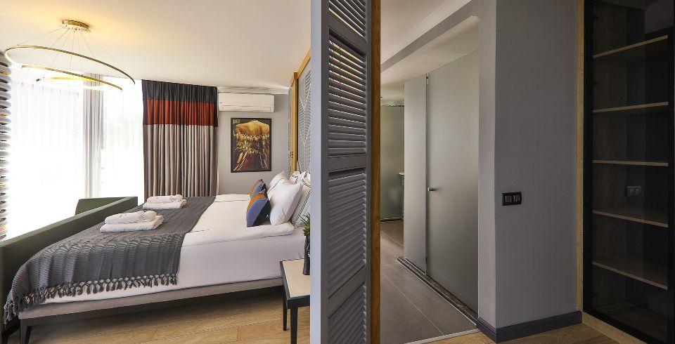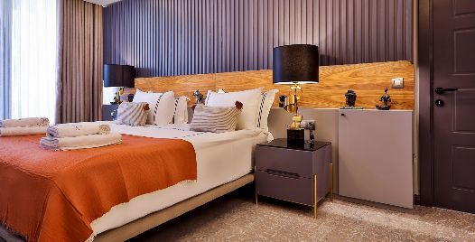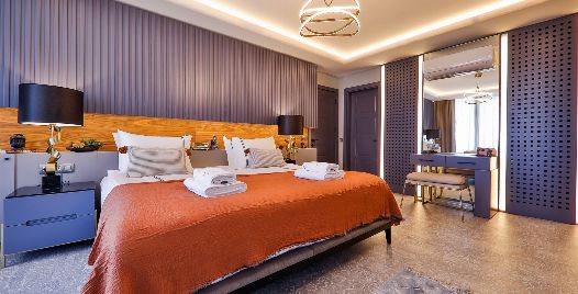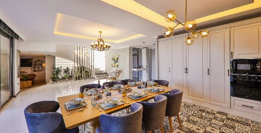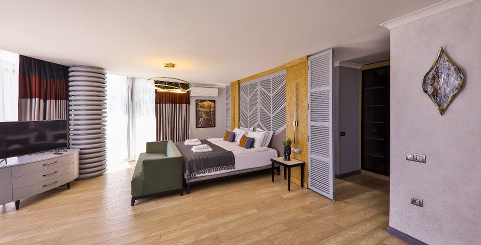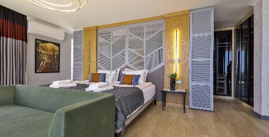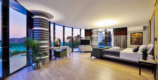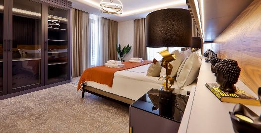 4. Yatak Odası: Teras katında bulunan en-süit yatak odasında çift kişilik yatak, makyaj masası, klima, elbise dolabı, komodin, balkon, jakuzi ve banyo bulunmaktadır.