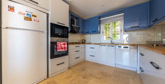 Mutfak : Mutfağımız modern tasarım olup Amerikan mutfaktır aynı zamanda içerisinde buz dolabı, bulaşık makinası, çay ve kahveleriniz için su kaynatıcısı, ekmek kızartma makinası, tost makinası, fırın, ocak, mikrodalga fırın, sebil, 6 kişilik yemek masası, geniş kapasiteli yemek takımları ve aynı zamanda küçük araç gereçler, çatal ve bıçak takımları, yemek pişirebileceğiniz tencere ve tava takımları, bardaklar bulunmaktadır. Mutfak tarafından da havuza geçiş yapabilirsiniz.