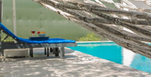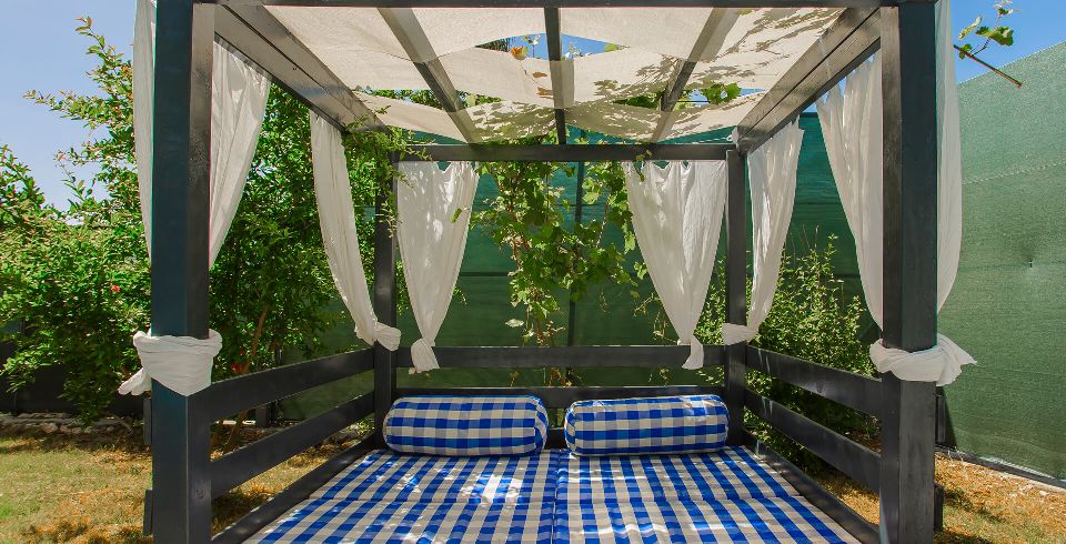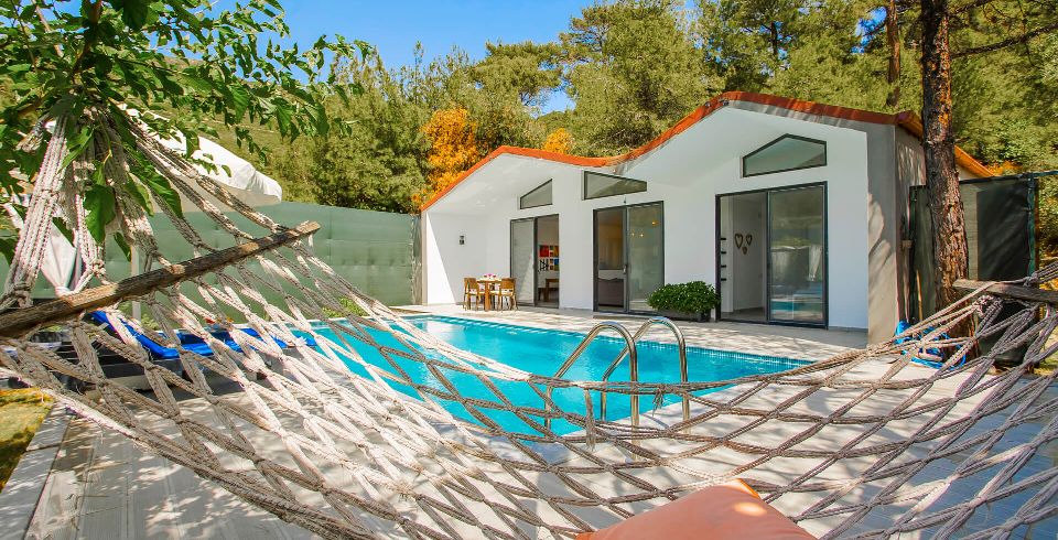 Bahçe : Bahçe içerisinde güneşlenme terası, özel yüzme havuzu, şezlonglar, güneş şemsiyesi, 2 kişilik bahçe yemek masası ve sandalyeler, hamak salıncak mangal bulunmaktadır.