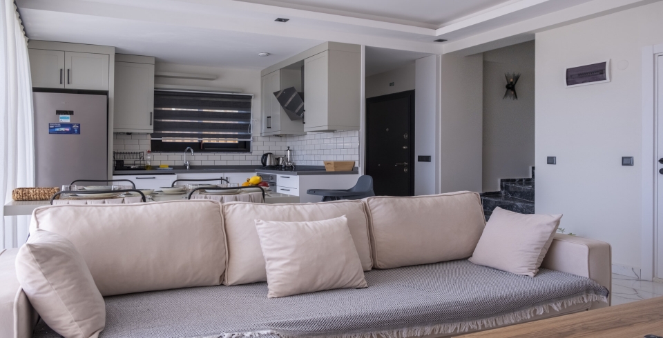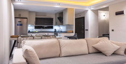 Salon: Özenle döşenmiş salon, modern koltuklar, 4 kişilik yemek masası, LCD TV ve klima bulunmaktadır.