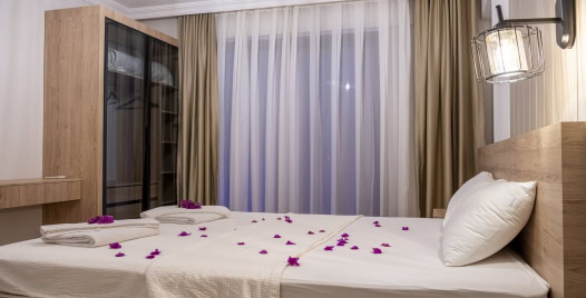 1.Yatak Odası: 1 adet çift kişilik yatak, elbise dolabı, komodin, klima, makyaj masası, banyo ve lavabo bulunmaktadır.