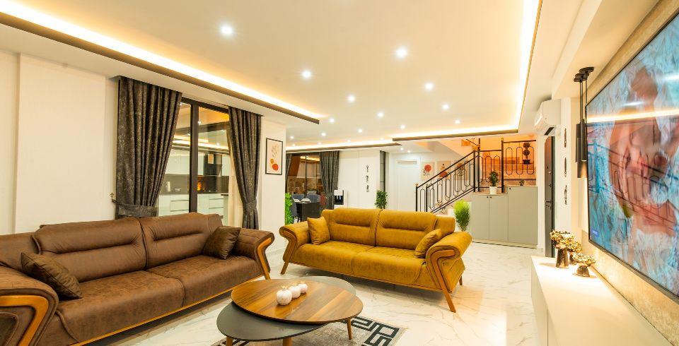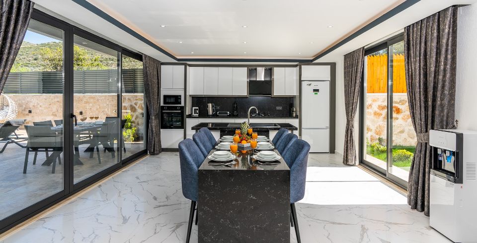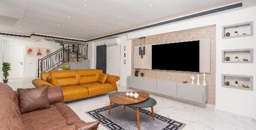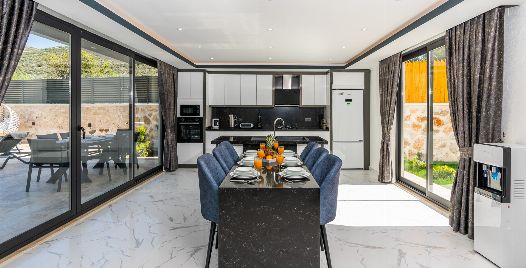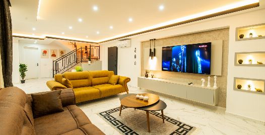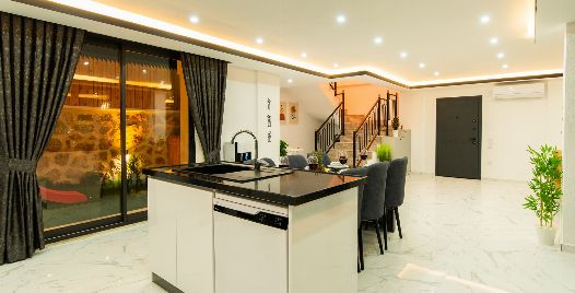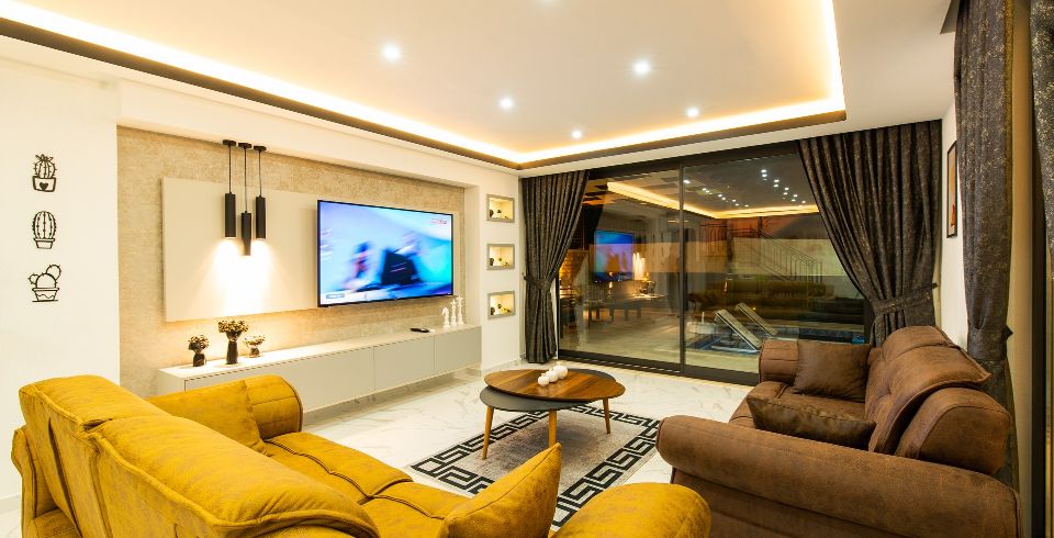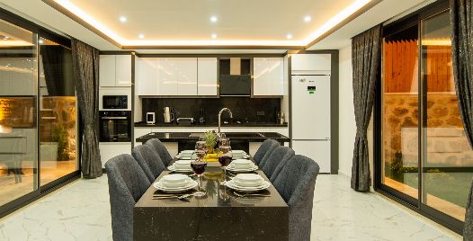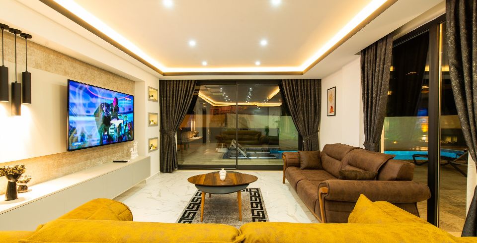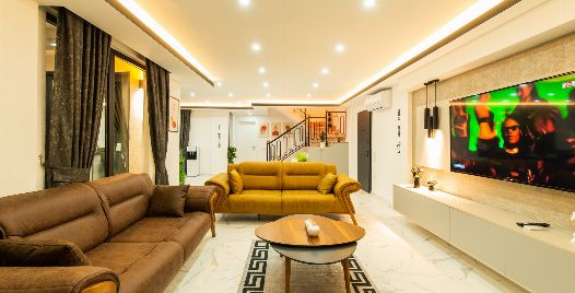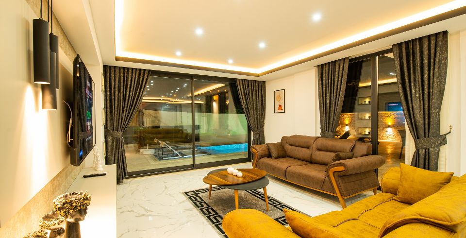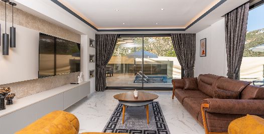 Salon : Villamızın iç dizaynı da son modaya uygun olarak modern bir şekilde tasarlanmıştır. Çeşitli dekoratif eşyalarla süslediğimiz salonumuz havuzlu bahçeye açılıyor. Villa’nın salonunda oturma grubu, TV, internet, klima, yemek masası, sehpa bulunmaktadır.