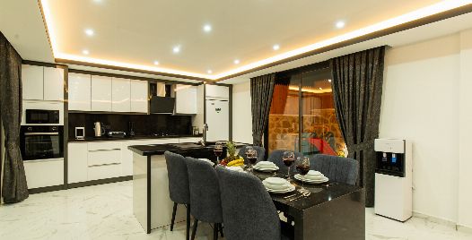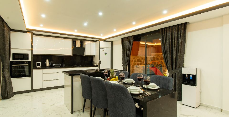 Mutfak : Modern Amerika mutfağımızda 4 kişilik yemek masası, mikrodalga fırın, buzdolabı, çamaşır makinesi, 4’lü ocak, tost makinesi, elektrikli su ısıtıcısı, çatal-bıçak takımı, tencere-tava takımı, bulaşık makinesi bulunmaktadır.