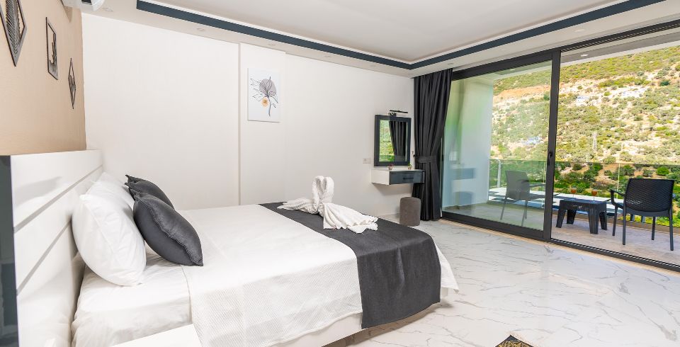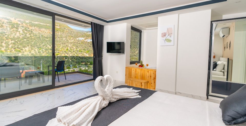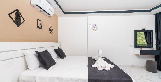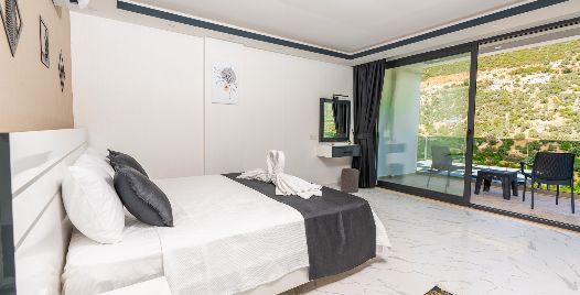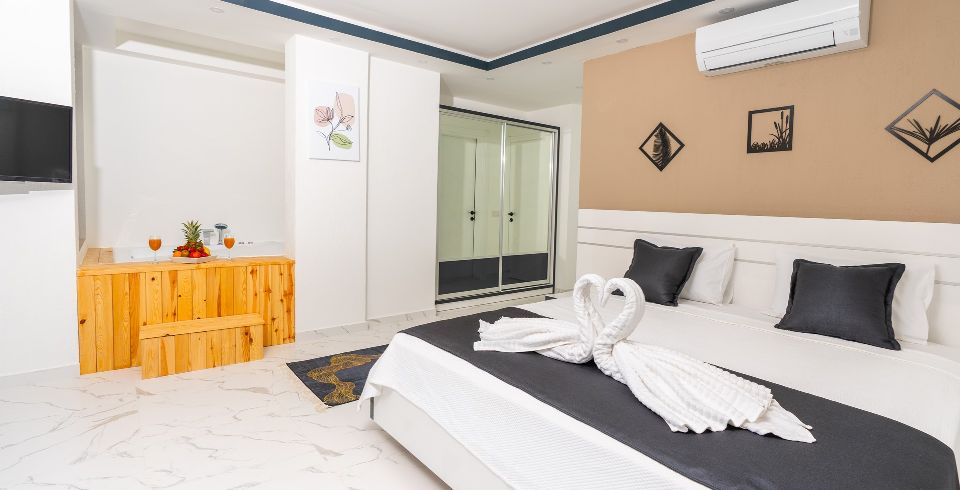 1. Yatak Odası : Doğa ile iç içe olan villamızın yatak odası manzarasında da sizi sonsuz güzel yeşillikler karşılayacak. Eşsiz doğa manzarasına karşı bir de jakuzi bulunmaktadır. Beraberinde çift kişilik yatak, klima, komodin, makyaj masası, banyo ve lavabo bulunmaktadır.
