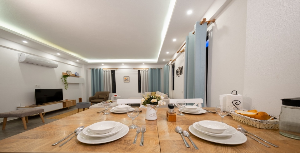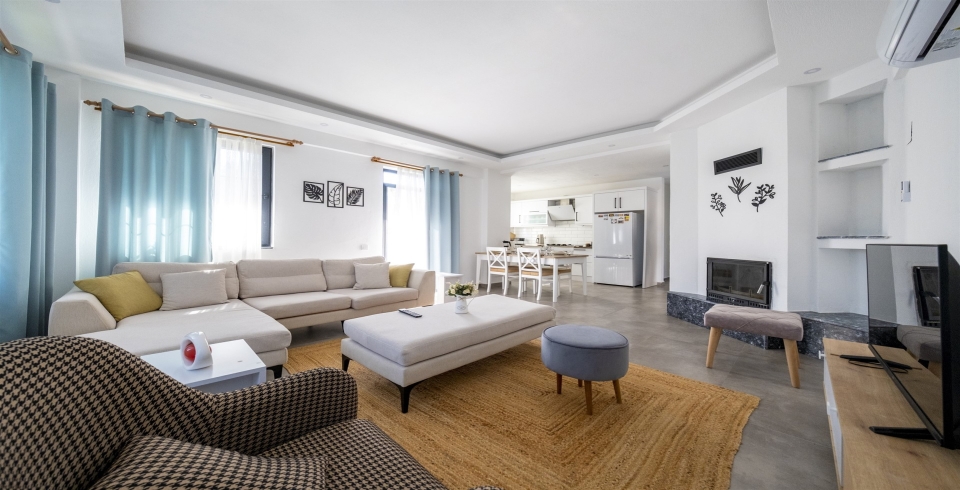 Salon : Sizi şık bir oturma grubu ile klima, televizyon, internet, uydu, koltuk, sehpa ile ferah bir salon bekliyor olacaktır. Havuz terasına çıkış yapılmaktadır.