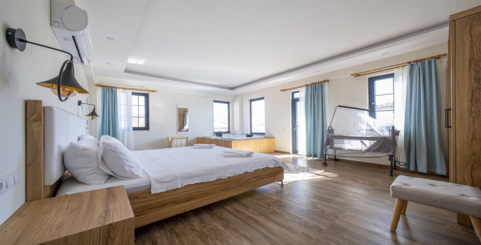 1. Yatak Odası : 1 adet çift kişilik yatak, klima, jakuzi, komodin, elbise dolabı, makyaj masası, banyo ve lavabo bulunmaktadır.