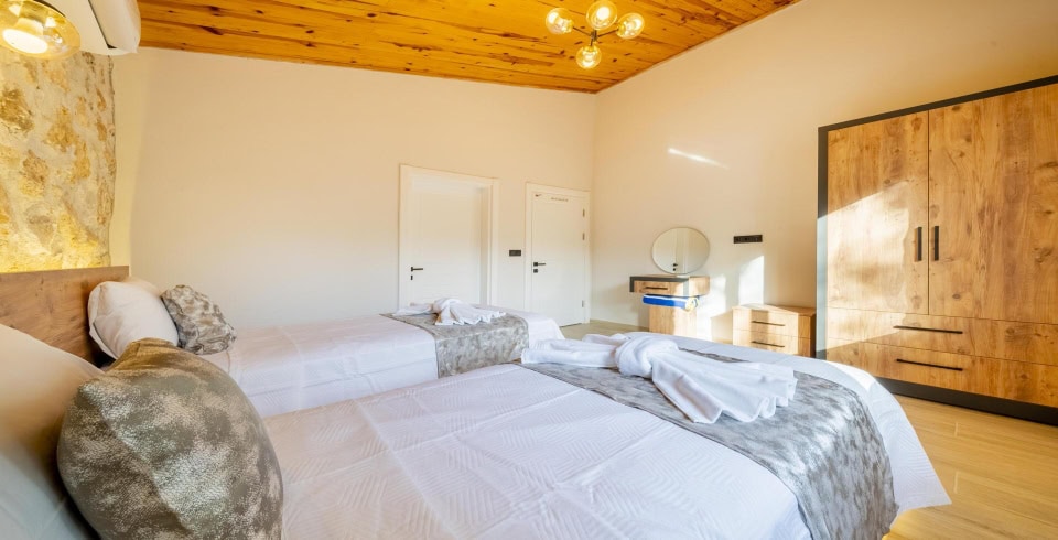 2. Yatak Odası: 2 adet tek kişilik yatak, elbise dolabı, komodin, klima, banyo ve tuvalet bulunmaktadır.