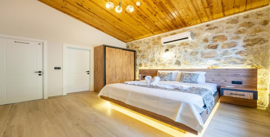 1. Yatak Odası: Çift kişilik yatak, elbise dolabı, komodin, klima, banyo ve tuvalet bulunmaktadır.
