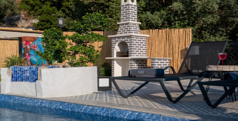 Havuz ve Bahçe :Özel yüzme havuzu, şezlong, şemsiye, sehpa, yemek masası, sandalyeler ve barbekü (mangal) bulunmaktadır.