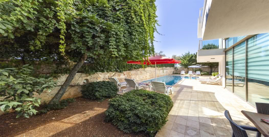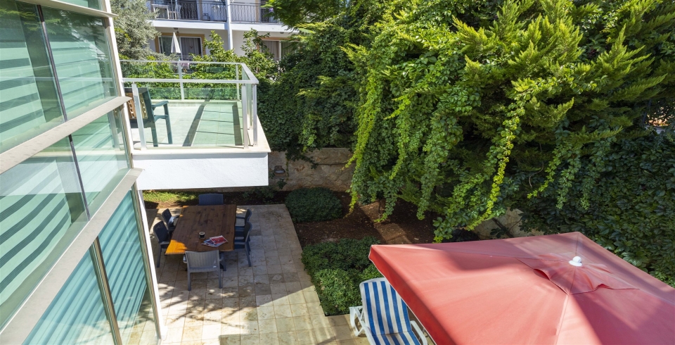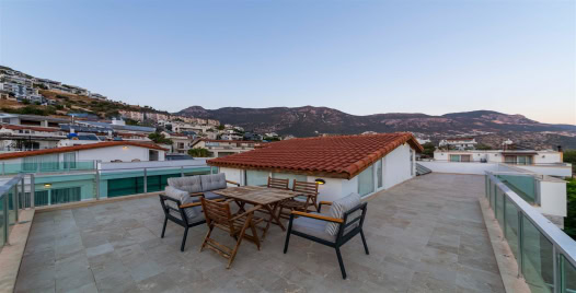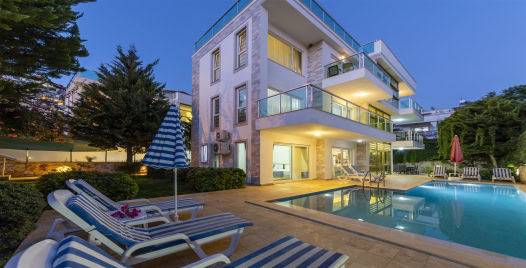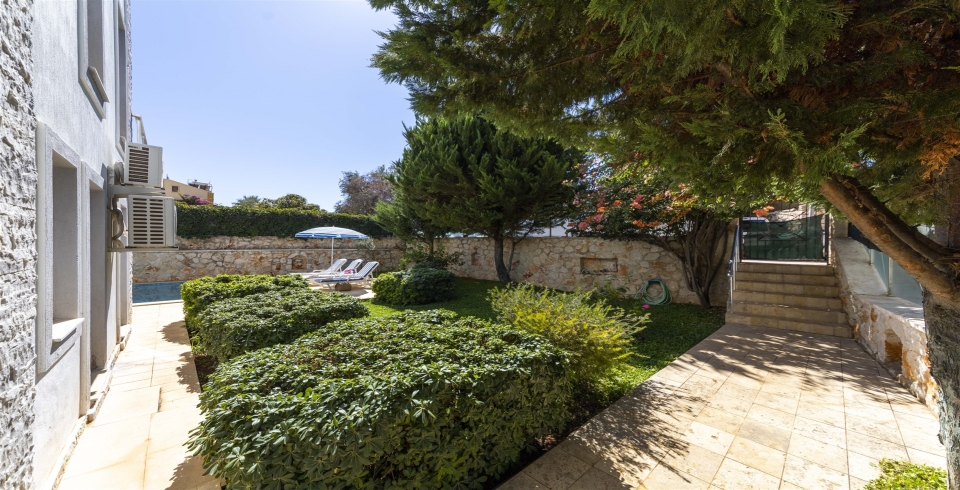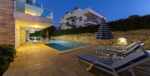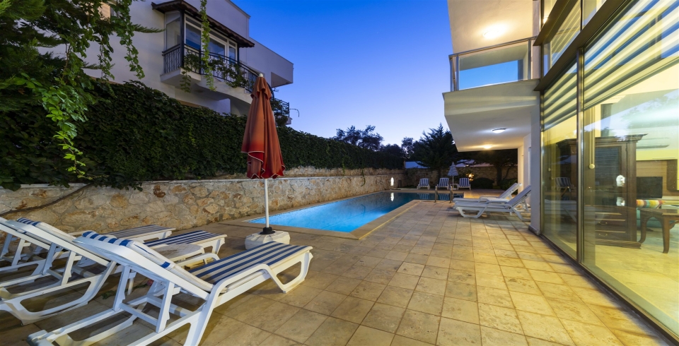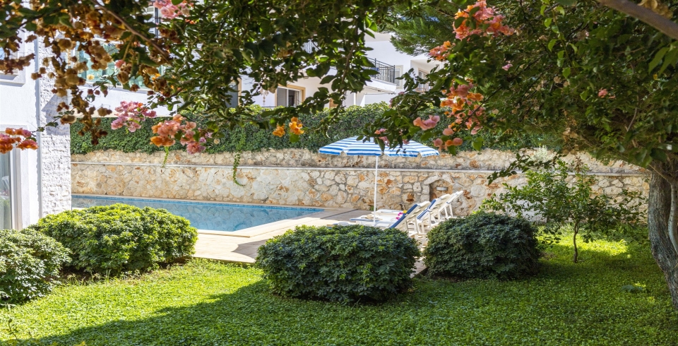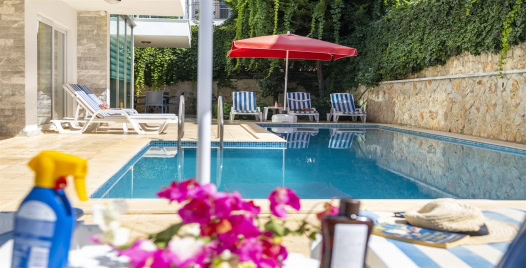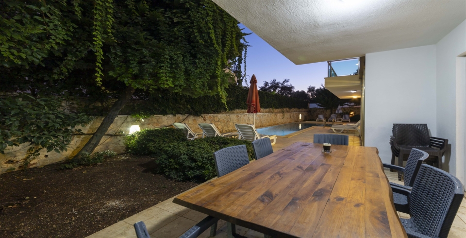 Bahçe : Villamız özel bahçesinde özel yüzme havuzu, güneşlenme terası, şezlong, güneş şemsiyesi, bahçe masası ve sandalyeler, taş barbekü, çardak, duş ve tenis masası bulunmaktadır.