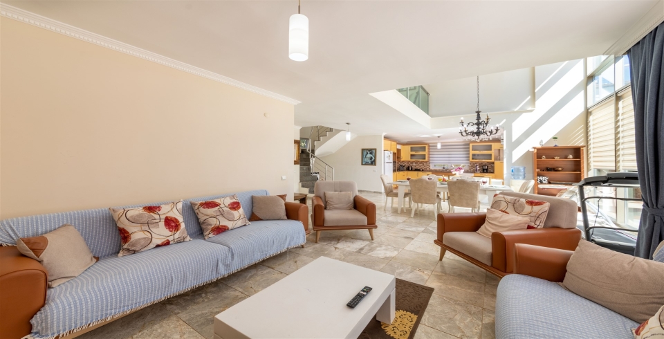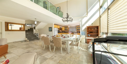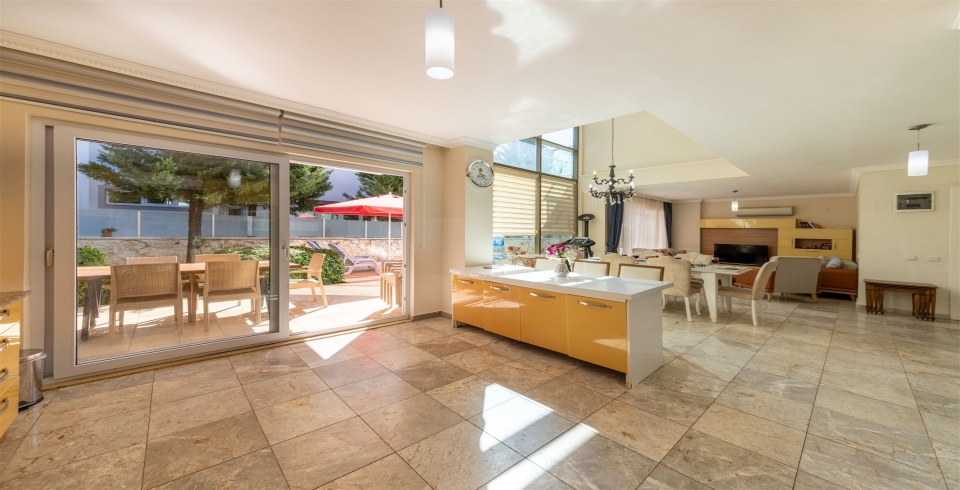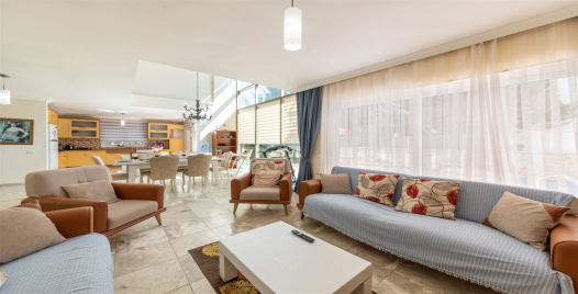 Salon : Salonda masa ve sandalyeler, LCD TV, uydu alıcı, ses sistemi, DVD Player, oturma grubu, ütü ve ütü masası, lavabo, kablosuz modem, elektrik süpürgesi, lavabo ve tuvalet bulunmaktadır. Salondan havuz kenarına çıkış vardır.