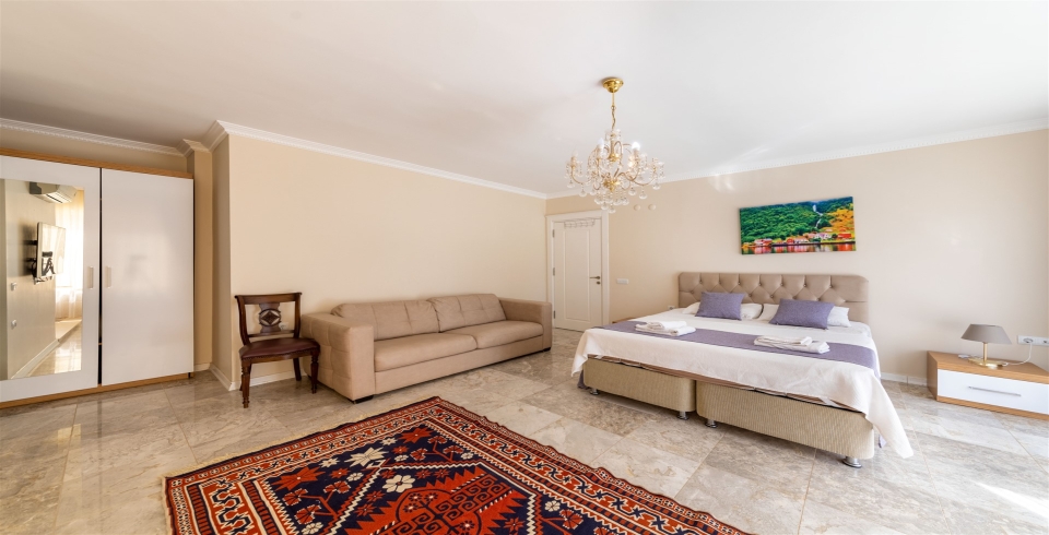 5. Yatak Odası : Klimalı süit yatak odasıdır. Yatak odasında makyaj masası, 1 adet çift kişilik yatak, elbise dolabı, banyo ve tuvalet bulunmaktadır.