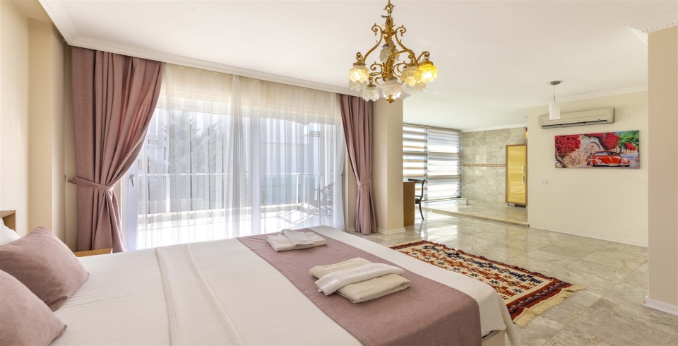 1. Yatak Odası : Klimalı süit yatak odasıdır. Yatak odasında 1 adet çift kişilik yatak, makyaj masası, elbise dolabı, banyo, tuvalet balkon bulunmaktadır.