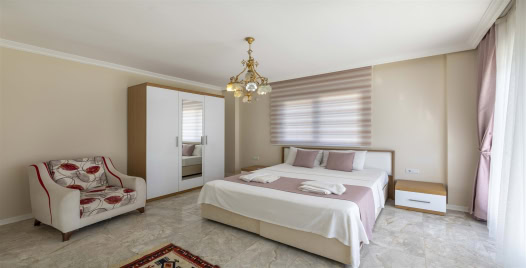 3. Yatak Odası : Klimalı Master süit yatak odasıdır. Oda içerisinde 1 adet çift kişilik yatak, elbise dolabı, komodin, banyo, tuvalet, makyaj masası, saç kurutma makinası bulunmaktadır.